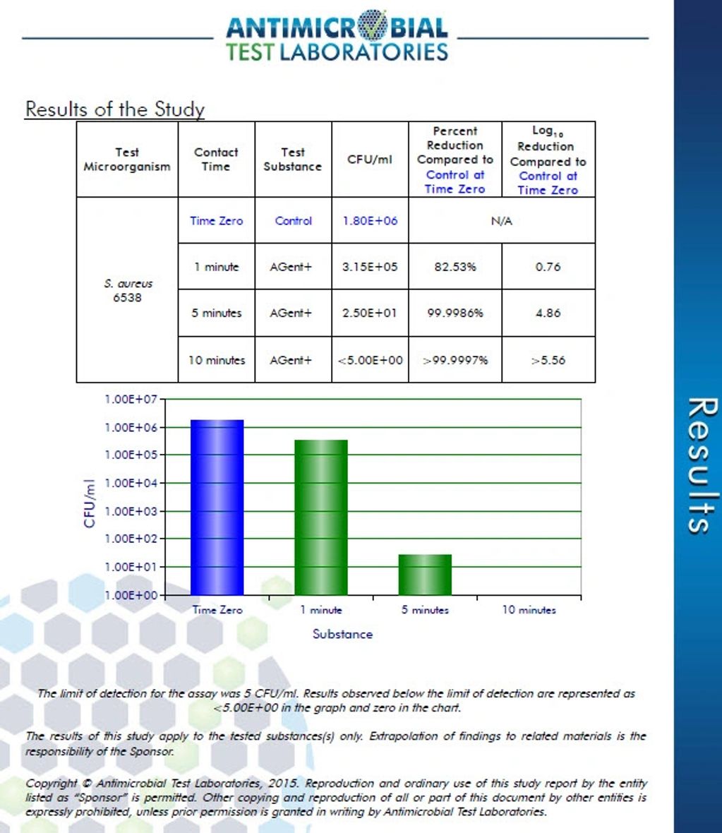 Result: As the test result shows the AGent+ Hard Surface was sprayed onto the Staphyloccoccus aureus 6538 and in just 5 minutes achieved a 99.9986% reduction, which is a greater than 4 log.