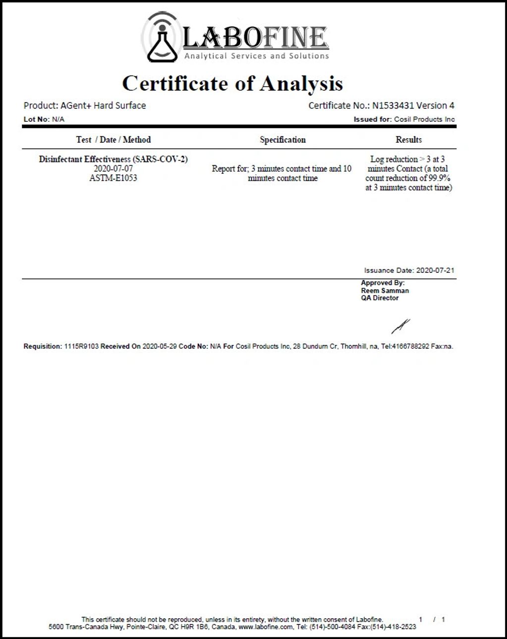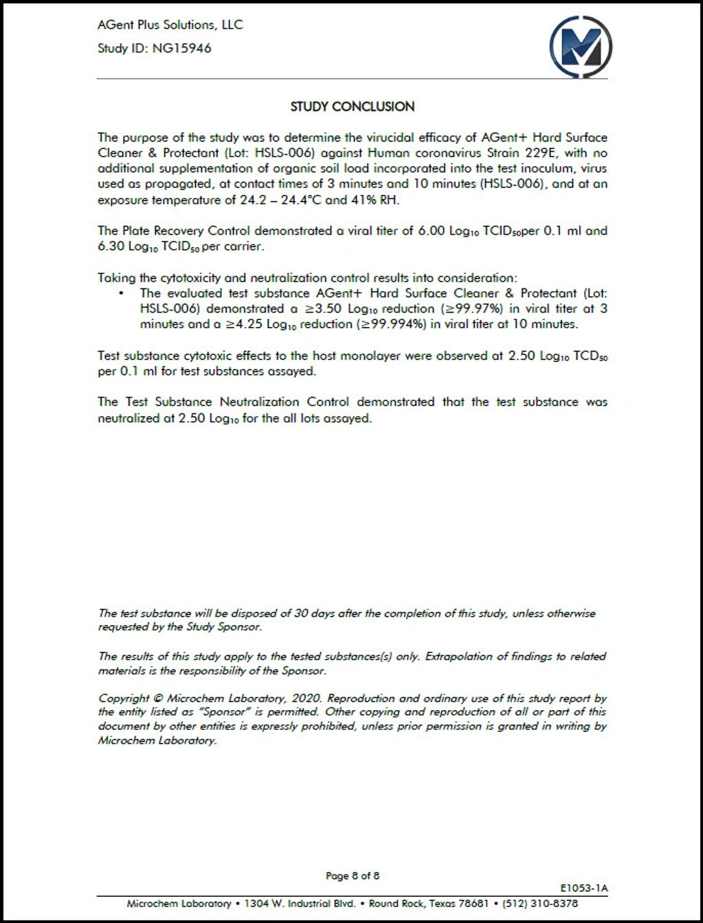 Result: AGent+ performed amazing. As the test result shows the AGent+ Hard Surface was sprayed onto the SARS-COV-2 virus. The result in only 3 minutes was that there was a greater than 3 Log reduction, which means a greater than 99.9% reduction in the virus on the sample.